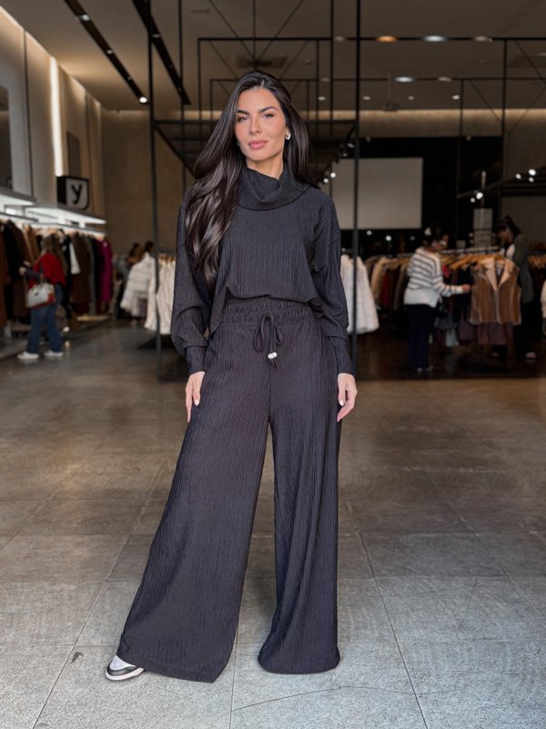 Conforto e estilo se encontram no Conjunto Lavínia! Feito em tricot com textura e elastano, ele é macio, quentinho e perfeito para os dias mais frios. A blusa de manga longa possui gola boba, que adiciona charme e elegância à peça. Já a calça pantalona tem cós em elástico que se ajusta ao corpo com conforto, amarração fake para um detalhe extra e bolsos funcionais. Disponível nas cores Preto, Off White, Azul Royal e Pink. Tamanhos: do 34 ao 52.✨